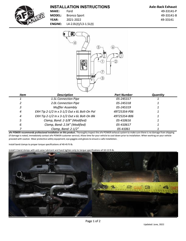 This axle-back exhaust system is constructed of 2-1/2 IN mandrel-bent 304 stainless steel tubing for maximum strength and durability. This system features a high-flow 304 stainless steel muffler, producing a deep sound. Finishing off this exhaust system is a 3-1/2 IN diameter polished 304 stainless steel clamp-on exhaust tip. The tip features a laser etched aFe POWER logo for a unique style. This system produces a deep sound unleashing all available horsepower and torque. Cutting is required, see instruction sheet for further information. Utilizing factory style hangers this system mounts directly to factory mounting locations for a hassle-free installation. State-of-the-art computer-aided design technology is utilized for precise vehicle fitment. 100% MIG-Welded for race-proven strength and durability.