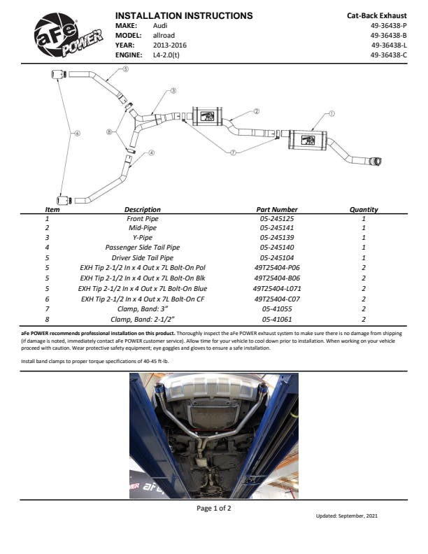 This cat-back exhaust system is constructed of 3 IN to 2-1/2 IN mandrel-bent 304 stainless steel tubing for maximum strength and durability. This system features high-flow stainless steel mufflers, producing a mild sound. Finishing off this exhaust system are dual 4 IN diameter blue flame 304 stainless steel clamp-on exhaust tips. The tips features a laser etched aFe POWER logo for a unique style. This system produces a mild sound unleashing all available horsepower and torque. Utilizing a factory style flange and hangers this system is a direct bolt-on system, which requires no cutting or modifications for a hassle-free installation. This cat-back exhaust system uses a heavy duty flex pipe with an internal interlock liner for added strength and durability. Utilizing state-of-the-art computer-aided design technology, this exhaust system is designed for custom, high tolerance factory fitment. 100% MIG-Welded for race-proven strength and durability.