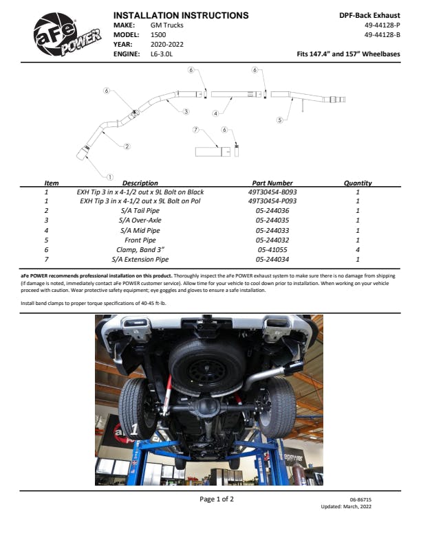 This DPF-back exhaust system is constructed of 3 IN mandrel-bent 409 stainless steel tubing for maximum strength and durability. Finishing off this exhaust system is a 4-1/2" diameter black 304 stainless steel clamp-on exhaust tip. The tip features a laser etched aFe POWER logo for a unique style. Utilizing factory style hangers this system is a direct bolt-on system, which requires no cutting or modifications for a hassle-free installation. This DPF-back exhaust system uses a heavy duty flex pipe with an internal interlock liner for added strength and durability. Utilizing state-of-the-art computer-aided design technology, this exhaust system is designed for custom, high tolerance factory fitment. 100% MIG-Welded for race-proven strength and durability. Intercooled tubing provides reduction in exhaust gas temperatures.