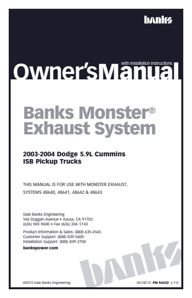 The 4 inch Monster exhaust system flows up to 122 percent better than stock and virtually eliminates backpressure. Banks streamlined 4 inch turbine outlet pipe with provision to retain stock catalytic converter, intermediate pipe(s) and tailpipe are formed of stainless, heavy-wall tubing with constant-diameter bends to maximize airflow and lower exhaust gas temps. Banks replaces the factory's restrictive muffler with a polished-stainless Monster muffler featuring a straight-through 4 inch diameter path that flows up to 129 percent better than stock. The Banks-designed expansion chamber dissipates the annoying mid-range exhaust drone that accompanies most straight-through mufflers. Monster muffler utilizes spun ceramic, very-high-temperature packing and delivers an authoritative - but never intrusive - exhaust sound. And the 5 inch polished rolled-edge tip has an adjustable clamp for positioning on tailpipe. Get it in your choice of chrome-over stainless or high temp black! (And to help keep it looking good, there's a 1/2 inch air gap to keep heat from tarnishing the finish)