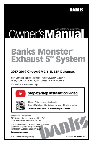 5" 409 stainless steel constant-diameter DPF-back system with negative backpressure SideKick tip. 85% less backpressure and 15% lower exhaust exit temps than stock, allowing the engine to produce more horsepower. Improves flow and cuts backpressure. Includes Huge Polished Chrome SideKick tip. Banks Power introduces the new 5" Monster Exhaust designed specifically for the 2017-2019 GM 6.6L Duramax L5P 2500/3500 HD pickup trucks. The DPF-back exhaust system features constant-diameter 5" mandrel-bent aluminized steel tubing and a massive tip which virtually eliminates backpressure after the DPF and prevents trailer meltdown.