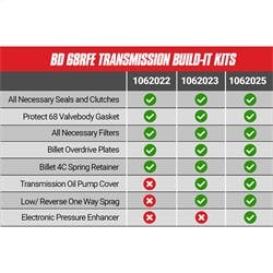 Are you a looking to rebuild your own transmission and needing some specialty parts to match your application? BD offers a range of rebuild parts kits featuring the same parts we use in our own performance transmissions for the seasoned builder to complete the job. All kits include the basic rebuild parts and gaskets and have the added touches that range from stock HP up to our Stage 4 Master Kit - which is pretty well everything we put in our own transmission rebuilds.