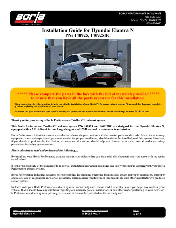 This 3" diameter BORLA® Cat-Back™ system was designed specifically for the Hyundai Elantra N. The BORLA®'s system features and Active Exhaust Valve which connects to the Original Equipment control system and provides variable sound levels. The ATAK® muffler provides an aggressive tone that is sure to turn heads. BORLA® is so confident of our engineering and technology in this system that we offer a no drone guarantee. The system features single round 5" black chrome on T-304 stainless steel tips on each tail pipe. Using BORLA® Stainless Steel Polish p# 21461 is NOT recommended with these black chrome tips. We suggest cleaning the tips with hot water and a microfiber cloth. A system with bright chrome on T-304 stainless steel tips is also available. BORLA® Cat-Back™ & Axle-Back exhaust systems feature patented straight-through and multi-core technology to unleash hidden horsepower. Increased exhaust velocity adds power, driving excitement, fuel economy, and the distinctive BORLA® Sound of Power respected by motoring enthusiasts everywhere. Each system is built from premium T-304 austenitic stainless steel, superior to T-400 series knockoffs (such as 409), to give you the absolute best in performance and durability. Ultra-smooth mandrel bends ensure maximum flow & power, and precision computer numerical control (CNC) manufacturing ensures an accurate fit. Best of all, BORLA® stands behind every system with a Million-Mile Warranty. Just what you‘d expect from the world‘s most experienced (and most winning) exhaust brand.