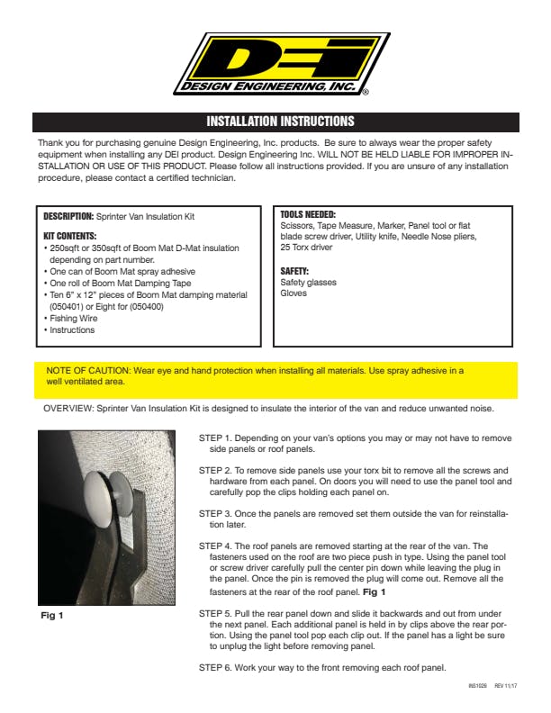 If you own a Sprinter Van you know how cold, loud and tinny sounding they can be. Increase comfort with DEI Boom Mat sound damping and insulation kit. Universal kits include enough insulation material to do either a short wheel base or long wheel base Van. Kits also include Boom mat damping material and spray adhesive to complete the installation along with instructions. Comfortable interior at any temperature Quick & easy installation Economical insulating solution D-MAT thermal acoustic insulation Universal kit