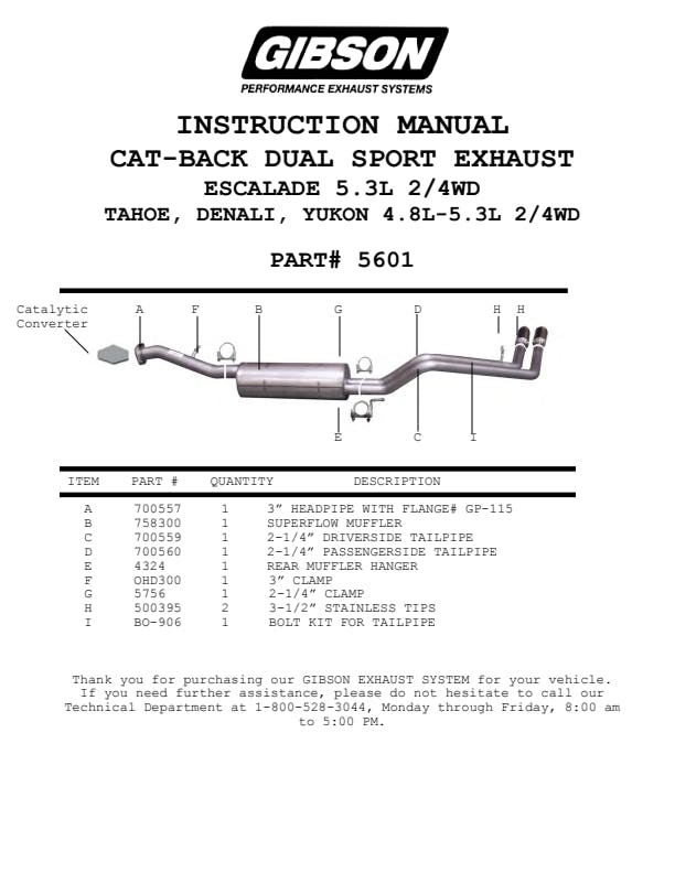 If youre looking to add a little style to your Truck or SUV and want to keep the exhaust from affecting your tow trailer, this Dual Cat back Exhaust System is for you, exiting behind the rear tire for a look that sets your vehicle apart on the street or in the dirt. Hassle free, bolt-on installation with professional looking results. No welding required. Backed by a Lifetime Limited Warranty. Gibson dual sport exhaust offers a powerful authoritative deep exhaust tone with no annoying noise inside the cab. Dyno tested to assure increased horsepower and produce more torque. Average horsepower gains are 10-15 and 15-20lb-ft of increase torque.