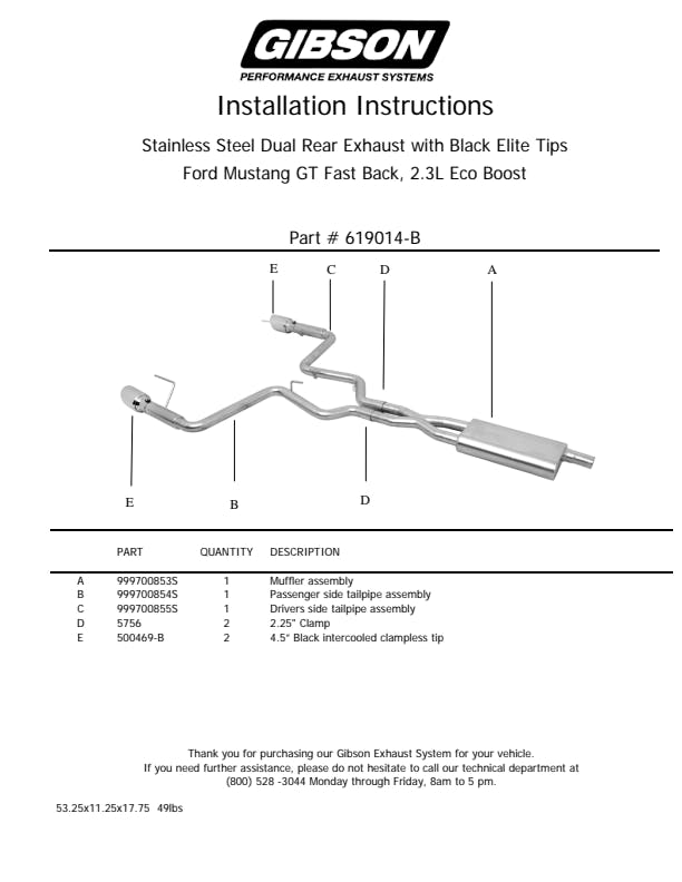 Gibson Performance Exhaust is proud to introduce a Power producing performance exhaust for the 2015 Ford Mustang 2.3L Eco-Boost. With over 30hp and 40 foot pounds of torque gained, it is sure to boost the Ego of your Eco-Boost. The direct-fit, 100% bolt-on Dual rear system starts with our SuperFlow CFT muffler leading the way to a tuned 2.25 in. equal length merged X-pipe. Once the high pitched sounds of the Eco-Boost collide, we force the exhaust through the exit pipes where we step up to a larger 3 in. diameter pipe introducing a controlled turbulence to help provide the deeper aggressive sound we expect from a Turbo powerplant To match the quality of sound with looks, the Gibson Dual EcoBoost system is finished off with large 4.5 in. diameter Stainless steel tips offered in a Heavy Duty Black Elite Ceramic Coated Finish. Every Gibson Exhaust is in.Made in USA in. and offered with a Lifetime Limited Warranty.
