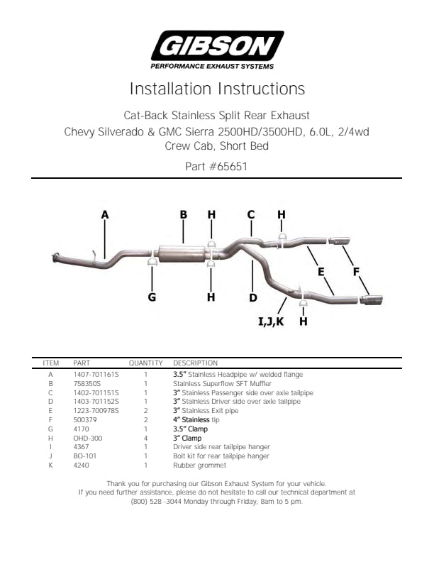 For the enthusiast who wants an awesome look and aggressive throaty sound this Dual Split Cat back exhaust is for you. Gibson Exhaust Systems decrease backpressure and produce more torque and increased horsepower. Typical gains average of 15-20 horsepower. Polished Stainless Tip exit straight out the back. Works with most bumpers, roll pans and trailer hitches. Exhaust sound is louder under towing conditions. Hassle Free bolt- on installation. No welding required. Backed by a Lifetime Limited Warranty.