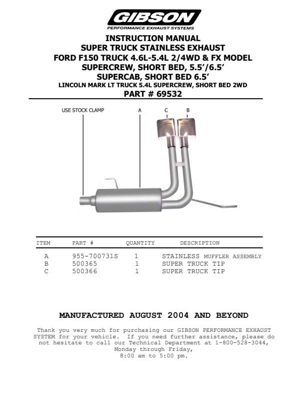 Your truck deserves a super serious Performance Exhaust System. Gibson Super Truck Exhaust System offers a loud deep powerful sound with dual tailpipes that exit in front of the rear tires with Stainless Tip. You can expect a race rumble tone with improved acceleration and increased horsepower gains. Typical dyno tested horsepower gains average 10-15 and 15-20lb-ft of increased torque. Hassle free, bolt-on installation. No welding required. Backed by a Lifetime Limited Warranty. Not recommended for towing. Noise level may exceed 95-decibel standard.