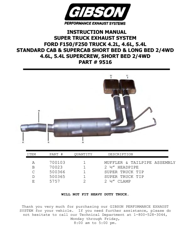 Your truck deserves a super serious Performance Exhaust System. Gibson Super Truck Exhaust System offers a loud deep powerful sound with dual tailpipes that exit in front of the rear tires with Stainless Tip. You can expect a race rumble tone with improved acceleration and increased horsepower gains. Typical dyno tested horsepower gains average 10-15 and 15-20lb-ft of increased torque. Hassle free, bolt-on installation. No welding required. Backed by a Lifetime Limited Warranty. Not recommended for towing. Noise level may exceed 95-decibel standard.