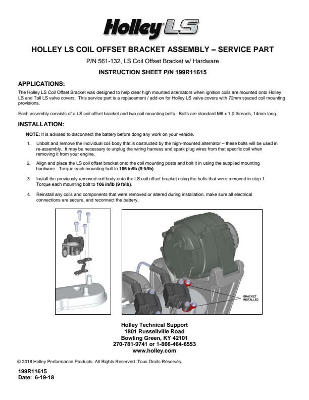 The Holley LS coil offset bracket was designed for use on vehicles equipped with Holley LS valve covers and high-mounted driver's side alternators. The bracket installs directly to the existing coil mounting posts and allows roughly 1" of extra clearance. This assembly was developed for use only with Holley cast aluminum LS valve covers with coil mounting provisions (72mm bolt spacing) and 5th gen LS coil bodies. Each bracket assembly includes one LS coil offset bracket and two mounting bolts.