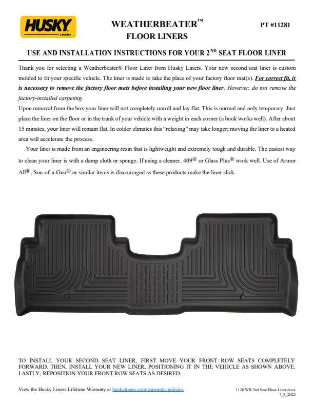 - WeatherBeater(TM) Liners offer protection that extends all the way to your rear seats. So go ahead, lift the seats and leave them up, load after load. Husky's got your floors, and your back, no matter what the road brings your way.