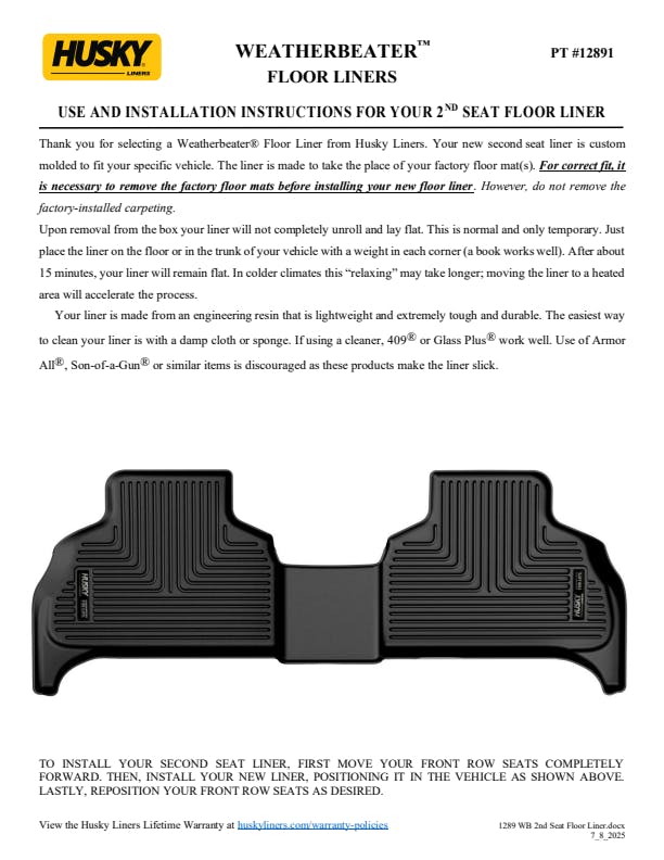 - WeatherBeater(TM) Liners offer protection that extends all the way to your rear seats. So go ahead, lift the seats and leave them up, load after load. Husky's got your floors, and your back, no matter what the road brings your way.