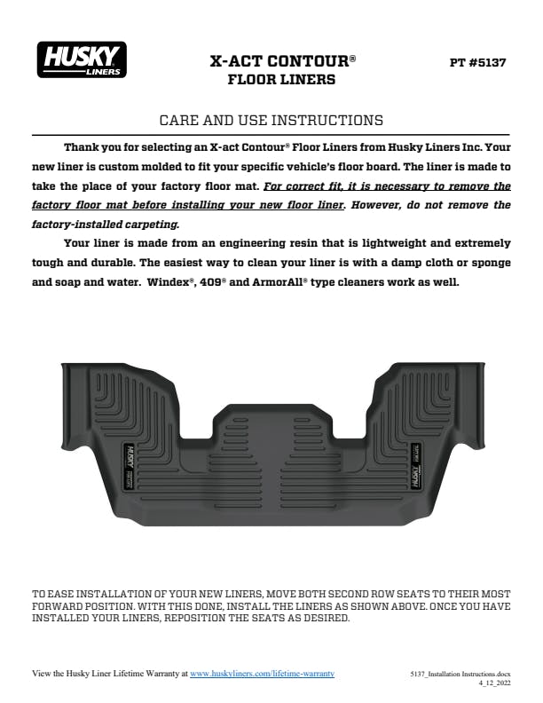Nothing fits your vehicle better or protects longer than Husky X-act Contour?. These liners combine laser-scanned, exact fit with a no-slip, DuraGrip? surface and a softer feel. Plus, the rock-solid stability delivered by your vehicle?s factory retention posts, and our StayPut? Nibs for a no-slip, no-slide, surface with absolutely zero compromise in protection. They?re built to stand up to whatever you?re laying down? including chemicals like battery acid and oil, with our FormFit Edge? to keep whatever spills contained for easy cleanup. Available in black. Built for a lifetime of rugged abuse, warrantees the same.