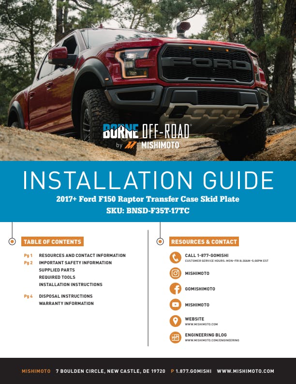 The Raptor is a truly capable offroad vehicle, and it should be, because that’s exactly what it was designed for. Even though it’s meant to thrash through dunes and trails, there are still some improvements that can be made on the truck. Off-road or on, there are always hazards to protect your truck from. The Borne Off-Road Skid Plate provides significantly greater strength, coverage, and protection over the factory underside shields. Whether you are pounding the pavement or slinging dirt, protect your Raptor’s Transfer Case from damage with the Borne Off-Road Transfer Case Skid Plate. Designed to be tough as nails, the Borne Off-Road Transfer Case Skid Plate is constructed from 5/32-inch plate steel and is ready to take whatever abuse you can to throw at it. Additional mounting points have been added to provide superior strength and those mounting points are all recessed to provide a smooth bottom surface. This eliminates the potential to shear off or get hardware caught on obstacles. They also utilize existing mounting points, so you don’t need to drill or tap to install. All corners and edges are bent at 80-degrees and reinforced to provide even greater strength. To ensure a long-lasting and durable finish, they are first electroplated via electro-galvanization and then powdercoated black. Designed to be direct-fit and including all hardware, install should take less than an hour with basic hand tools. Available for purchase individually, or for more protection, check out the Borne Off-Road Powertrain Skid Plate Kit. For the ultimate undercarriage protection, check out the Borne Off-Road Complete Skid Plate Kit. As with all our products, this skid plate comes with our signature Borne Off-Road Lifetime Warranty.