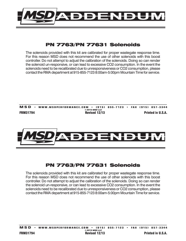 MSD Boost Controllers are the most accurate and easy to use controllers on the market. Both controllers plug directly into the Power Grid via the CAN bus which allows user to make adjustments through MSD View software. MSD Boost controllers feature two boost curves that can be toggled on the fly, a user adjustable boost vs. timing retard curve, pressure switch and an over boost shutdown to protect the engine. The Power Grid data acquisition will record manifold and wastegate pressure as well as solenoid operation. The MSD Boost Controller, PN 7763 has two built-in 4-Bar (43.5 psi) sensors. High boost application will require, PN 77631 which uses a pair of external 6-Bar (75 psi) sensors.