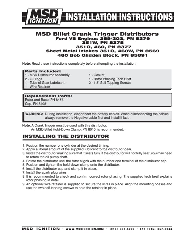 - Must be used with an MSD Crank Trigger and MSD Ignition Control
