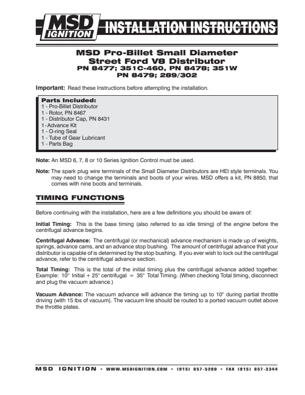 Small diameter distributor for 289/302 engines, includes iron gear and vacuum advance. Must be used with an MSD 6, 7 or 8-series ignition.