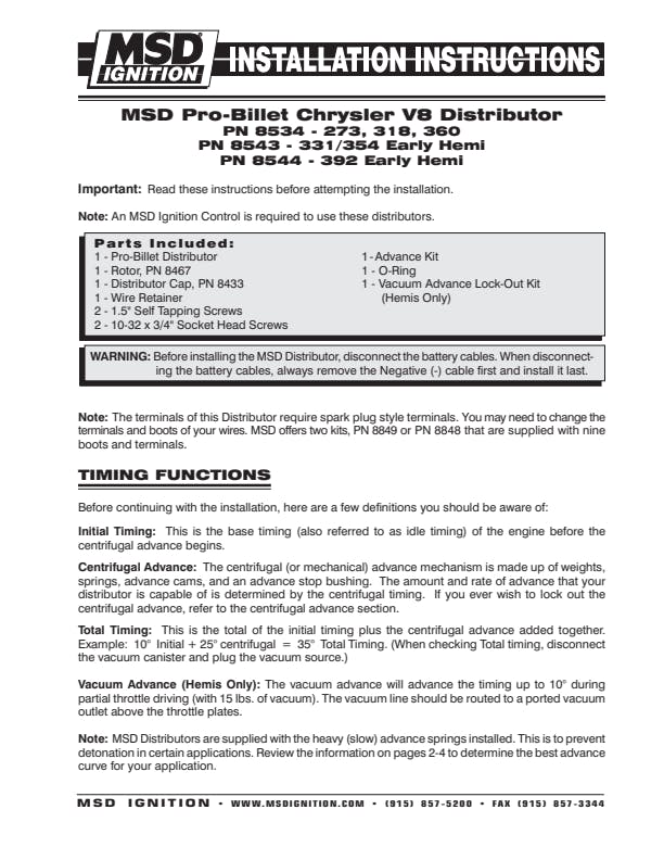 Get your Mopar fired up with billet accuracy and performance. Remove the MSD cap and Race Rotor and you'll find easy access to the adjustable mechanical advance assembly for easy adjustments. This advance is designed for accuracy and strength with TIG-welded weight pins, nylon pads for smooth movement of the weights and a QPQ coating for friction reduction. Different advance springs and stop bushings are supplied so you can custom tailor a timing curve to fit your Chrysler's needs.