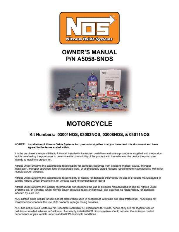 NOS motorcycle and ATV Fogger nitrous systems are an adjustable nitrous system specifically designed for popular powersports vehicles. With the jets included, these systems typically produce a power boost of 30-40 percent, but they're tunable for more power with additionally purchased jets if the need arises. This system includes everything needed including assembled nitrous bottle, handlebar activation push button, brackets, jetting, fuel pump, along with electrical and mounting hardware.