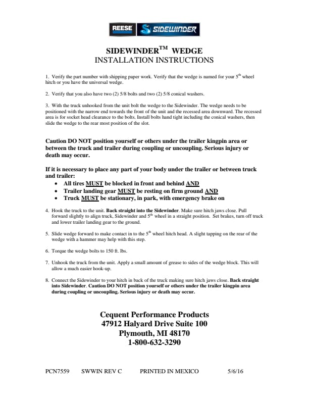 Designed to work with the Sidewinder and Airborne / Sidewinder. Replacement wedge that is desinged for specific fifth wheel hitches