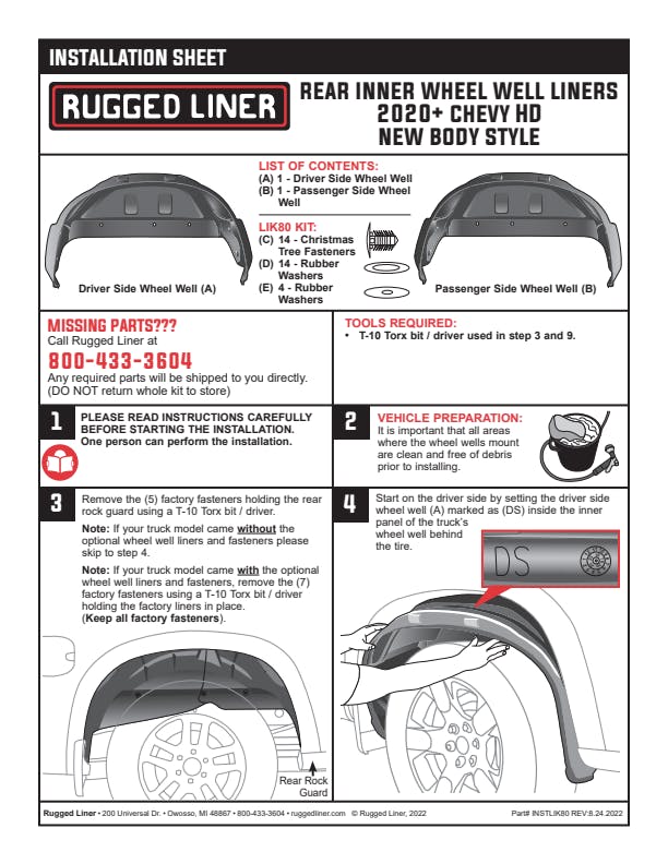 Rugged Liner Rear Wheel Well Inner Liners if you are looking to improve and finish the overall look and protect the inner workings of your vehicle from harmful elements. With a limited lifetime warranty you can be at ease knowing your investment is protected. Protects against damage from rocks, dirt, salt, road debris and weather elements. Quick and easy installation. Made in the USA